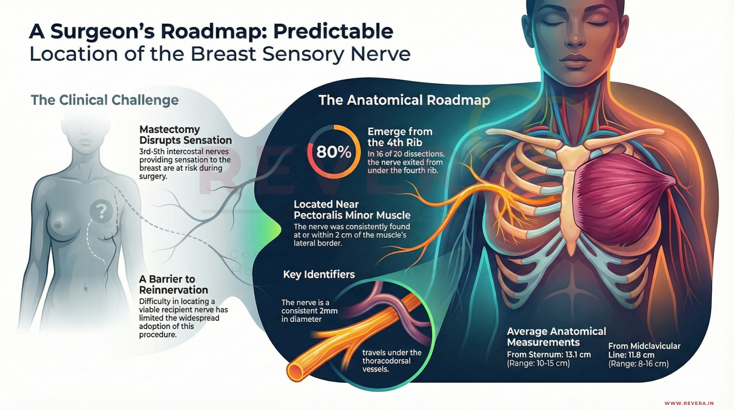 The sensory innervation of the breast is derived from the medial and lateral cutaneous branches of the third through fifth intercostal nerves. These nerves are frequently compromised during mastectomy procedures. While breast reinnervation has been a known surgical option for two decades, its adoption has been limited, largely due to the technical challenge of precisely locating the recipient nerve.